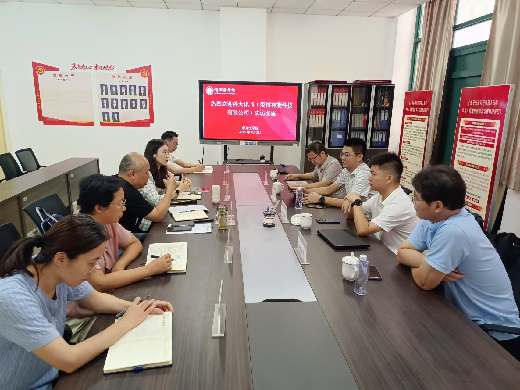 9月3日,科大讯飞(爱博智能科技有限公司)康复养老助残业务副总经理尹旭一行来院座谈交流。康复医学院党总支书记苗冠群、院长张元民参加座谈。