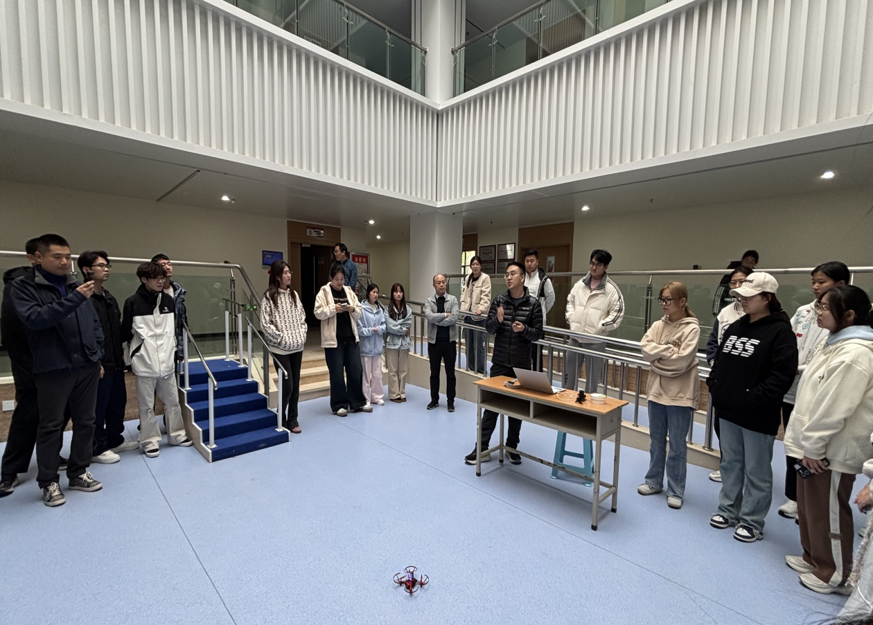 展演中,王璇现场演示脑机接口控制无人机的操作流程,讲解技术核心逻辑;他重点演示了脑机接口如何通过捕捉大脑神经信号,实现对无人机的精准控制,生动展现了该技术在智能装备、医疗康复等领域的广阔前景。陈建结合康复医学临床需求,补充分析该技术在辅助康复等领域的应用可能。师生围绕技术细节深入交流,纷纷表示通过展演深受启发。
